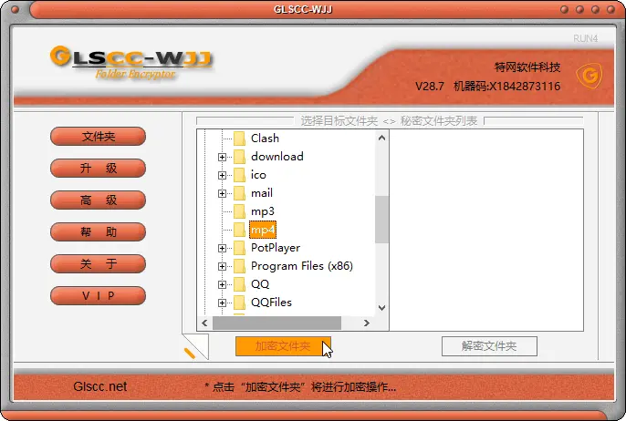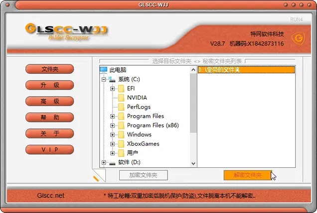 展开左侧的树状目录,选择需要加密的文件夹,单击“加密文件夹”按钮即可实现文件夹加密,被加密的文件夹会在窗口右侧一一列出,以便对加密的文件夹进行统一管理。 |